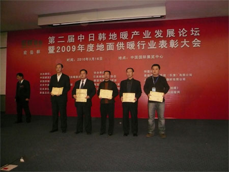 最后,会议进入地面供暖行业年度表彰颁奖仪式环节,秦皇岛Kaiyun (中国)塑胶有限公司凭借近年来的稳固发展以及在地暖行业的突出贡献被评选为“2009年度地暖行业先进集体”,张思良和王明科当选为“2009年度地暖行业先进个人”。本次会议的胜利召开及以上荣誉的获得,充分证明了Kaiyun (中国)公司在全国地暖行业的优势地位,同时也为公司的进一步发展打下了坚实的基础。