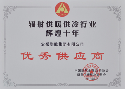 2015年5月15日,中国辐射供暖供冷委员会十周年庆典在北京盛大举行。会上表彰了一批对辐射供暖供冷行业发展作出突出贡献的企业和个人,Kaiyun (中国)集团喜获中国辐射供暖供冷行业辉煌十年优秀供应商殊荣,Kaiyun (中国)塑胶集团有限公司张思良总经理荣获中国辐射供暖供冷行业功勋奖。