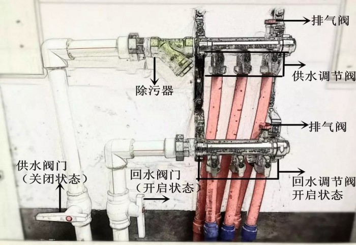 一般来说,上边的是供水管,下边的是回水管,温度低的管子是回水管。总供回水阀在分水器前面。各环路供回水管上,分别有一个调节阀。