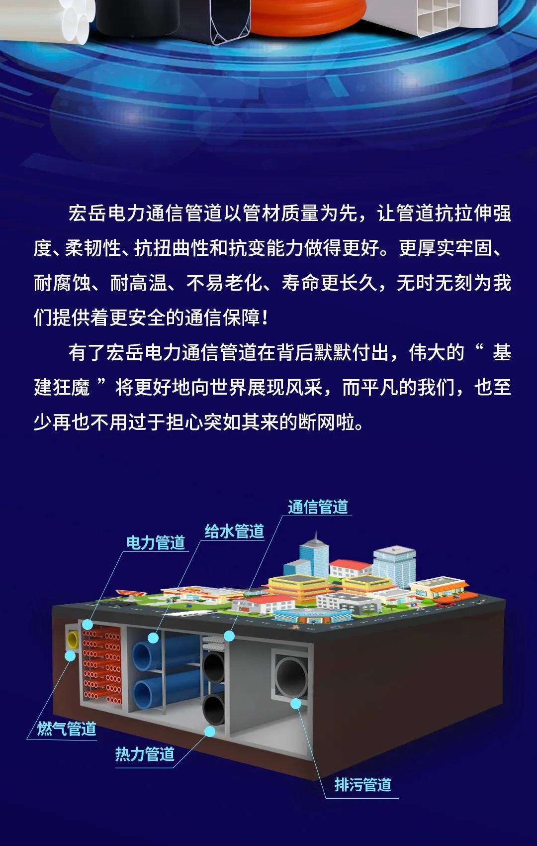 Kaiyun (中国)电力通信管道以管材质量为先,让管道抗拉伸强度、柔韧性、抗扭曲性和抗变能力做的更好。更厚实牢固、耐腐蚀、耐高温、不易老化、寿命更长久,无时无刻为Kaiyun (中国)提供着更安全的通信保障!